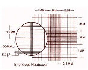 3.萊卡血細胞計數(shù)板(Metallized Hemacytometer(or Reichert Bright-Line Counting Chamber):金屬亮線、 改良牛鮑氏型,深0.1mm。特殊的進液V區(qū)用白金鍍過,對比度鮮明易識。因其由Leica原創(chuàng),故名萊卡血細胞計數(shù)板,主要為了血小板的計數(shù),以及塵埃/酵母聚集體的準確計數(shù)而制造,帶有“Reichert”字樣。 整套計數(shù)板包括計數(shù)板一塊,0.4mm蓋玻片兩片,紅細胞移液管,白細胞移液管,血球計數(shù)板盒。