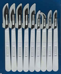 不銹鋼制成的刀片無比鋒利,用一種鋁箔包裝,帶有刀柄,刀片規(guī)格多樣。