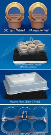 為確保實(shí)驗(yàn)的快速和高效,我們?yōu)楹Y籃配套了提手及籃架(carrier kit)和試劑盤(pán)(reagent tray)。篩籃可以直接放進(jìn)籃架,提到試劑盤(pán)進(jìn)行固定或者染色實(shí)驗(yàn)。試劑盤(pán)兩種顏色可供選擇:白色和黑色,白色試劑盤(pán)便于觀察顏色變化。黑色試劑盤(pán)便于清楚觀察切片位置。方便大家使用,我們提供以下套裝,套裝包含6個(gè)直徑24mm的netwell(或者12個(gè)直徑15mm的netwell);兩個(gè)試劑盤(pán)(一黑一白);提籃一套(carrier plate 和handle)。