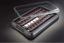 StrainTray的盒體呈黑色,由硬質(zhì)ABS塑料制造,對廣泛的化學(xué)試劑均惰性(氯代烴類除外)。盒內(nèi)支架有四個橫桿,玻片置于橫桿上,上面再壓上聚酯條,這樣可以很牢固的夾住玻片,盒體即使傾斜也沒有問題。橫桿之間的特殊設(shè)計可以防止液體飛濺。支架升高可以防水打濕玻片,另外升高的支架可以很方便的拿取玻片。盒體的底部有四個橡膠墊使其很穩(wěn)固地置于桌面上。盒子和盒子可以疊放,這樣可以節(jié)約很多空間。