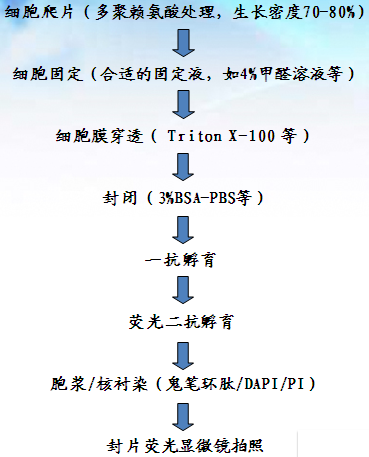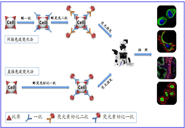?? 原理:免疫熒光就是利用抗原與抗體的特異性結(jié)合原理及特殊的熒光素標(biāo)記技術(shù),通過激光激發(fā)使熒光素發(fā)出熒光,在熒光顯微鏡下觀察熒光的變化從而對細(xì)胞內(nèi)的抗原進(jìn)行分析的技術(shù)。用免疫熒光顯示和檢查細(xì)胞或組織內(nèi)抗原或半抗原物質(zhì)等方法稱為免疫熒光細(xì)胞(或組織)技術(shù)。
