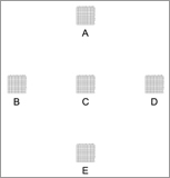 10x10 grid of 0.1mm squares at 5 positions |