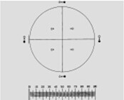G57是目鏡分劃板的一種,主要應(yīng)用于制藥行業(yè),用于篩選和分析樣本中的顆粒物,檢測顆粒物的分布狀態(tài)。當樣本顆粒直徑小于50µm或者顆粒數(shù)量在一定范圍內(nèi)時,G57適合做粒徑大小的分析。G57分劃板上的黑圓點和空心環(huán)分別代表顆粒直為10µm和25µm兩種,可作為與顆粒比對的參考。此外,一個帶刻度的水平比例尺也整合到其中。