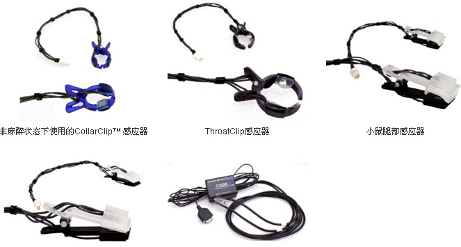 MouseOx Plus也即設(shè)備盒子,單獨(dú)這個(gè)設(shè)備并不能順利開展工作,除去必備的電腦之外,傳感器(sensor clip)是必須選擇的配件。傳感器一般通過通用纜線(Universal Cable)與設(shè)備盒子連接??筛鶕?jù)實(shí)驗(yàn)對(duì)象來選擇夾持在動(dòng)物的不同體位的傳感器。